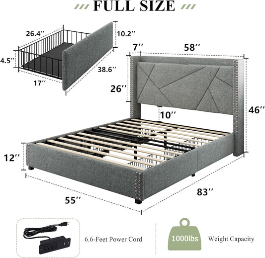 Feonase Full Size Bed Frame with 4 Storage Drawers, Upholstered Platform Bed with Charging Station & Wingback Headboard, Solid Wood Slats Support, No Box Spring Needed, Noise-Free, Light Gray