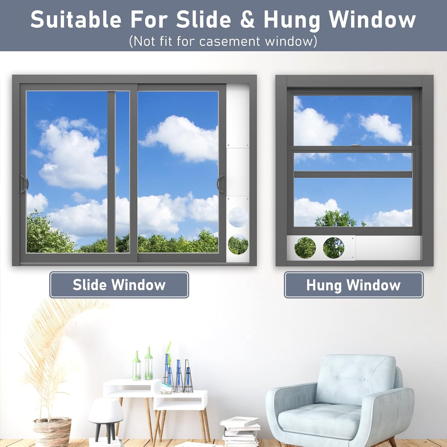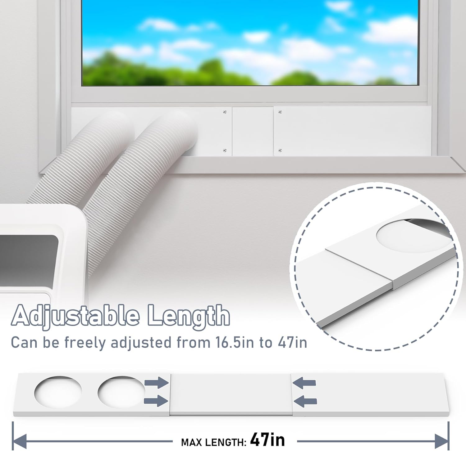 - 【Adjustable Design】The dual hose window vent kit includes 3 plates. You can adjust length according to your window size, maximum 47 inches. It can be applied to vertical and horizontal sliding windows.