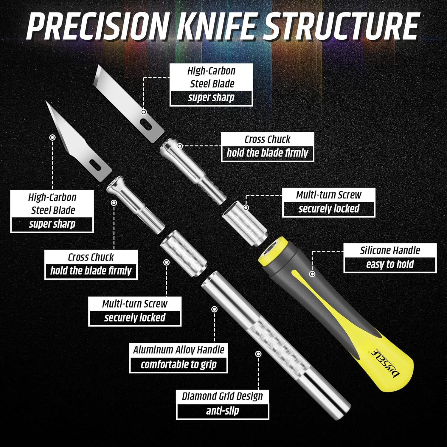 - 【Heavy Duty & Ergonomics】The blades of the crafting knife set are made of high carbon steel, high hardness and ultra sharp. The silver exactly knife's handle is made of aluminum alloy, lightweight, relieves hand fatigue. The yellow hobby knife's hanlde is made of silicone, non-slip and soft grip
