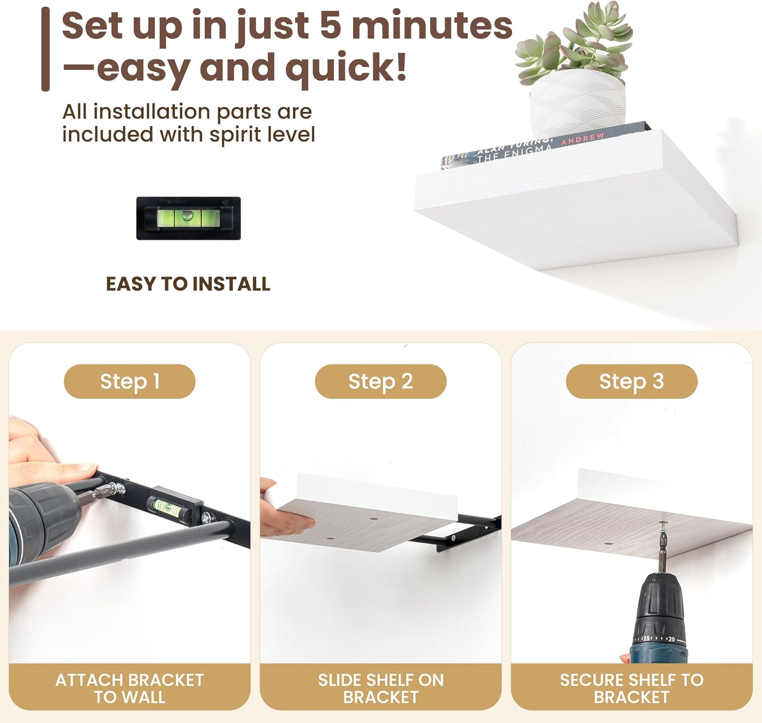 - Easy Installation: Each package includes 3 shelves, 3 invisible brackets, a hardware kit, and clear instructions. The installation is quick and simple, and all necessary components are included. If you need assistance, our customer service team is always ready to help with any installation questions.