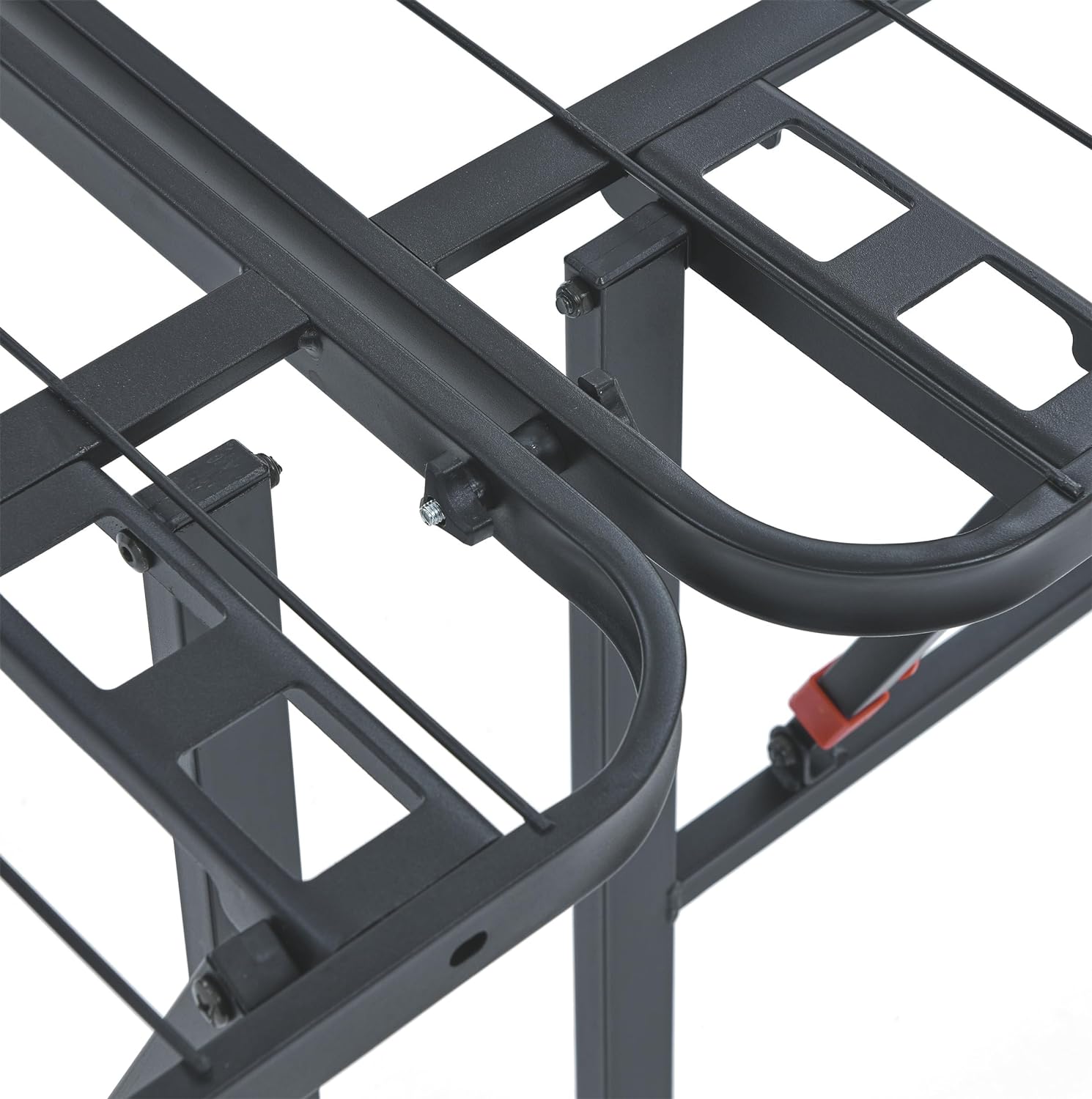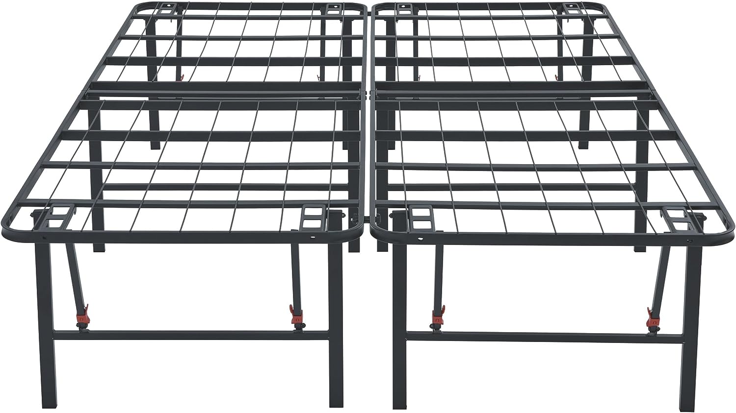 Queen-size platform bed frame offers a quiet, noise-free supportive foundation for a mattress; no box spring needed, Made of durable steel for reliable strength, Simple tool-free setup; folding mechanism for compact storing or moving up stairwells or through doorways, 265 pound weight capacity, Under-bed storage space with a vertical clearance of about 17 inches,