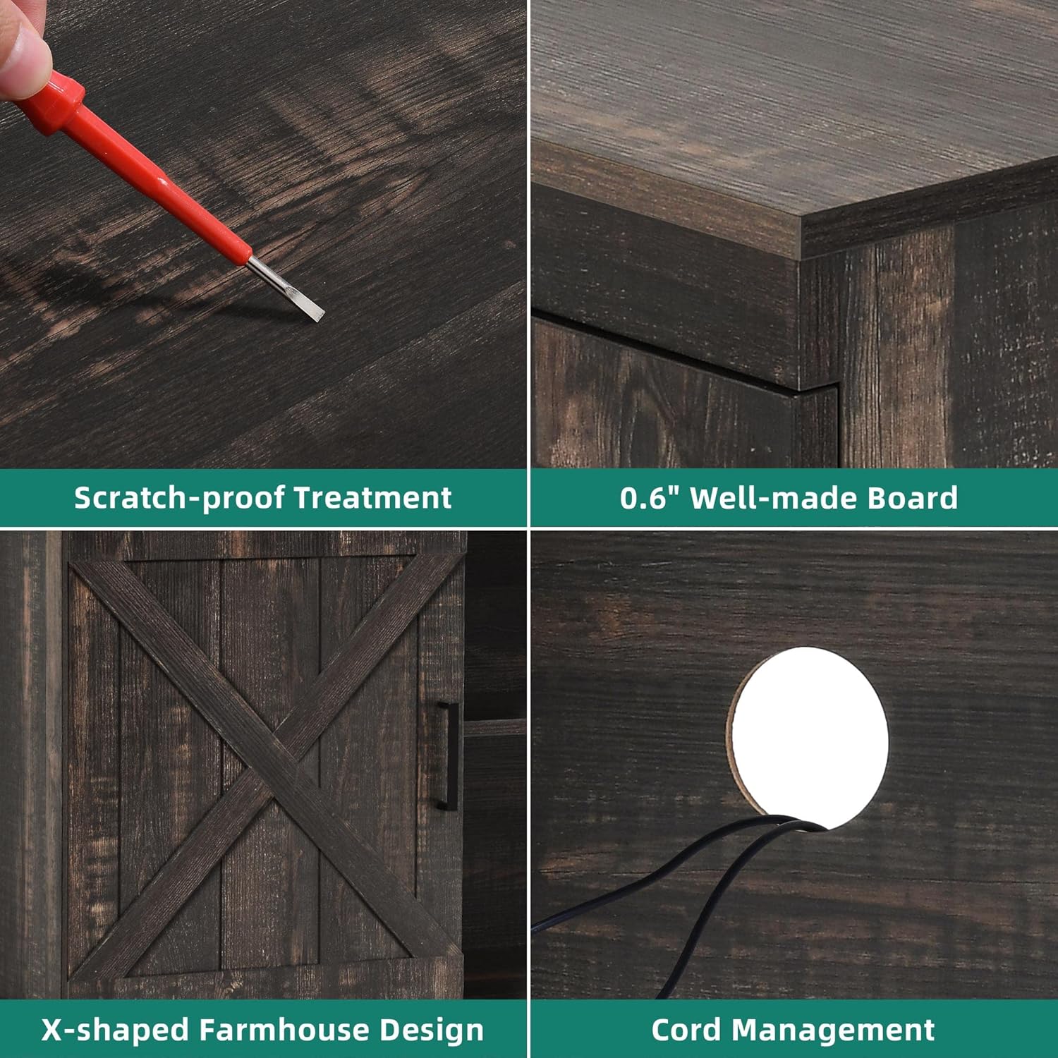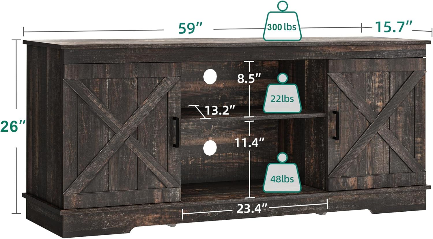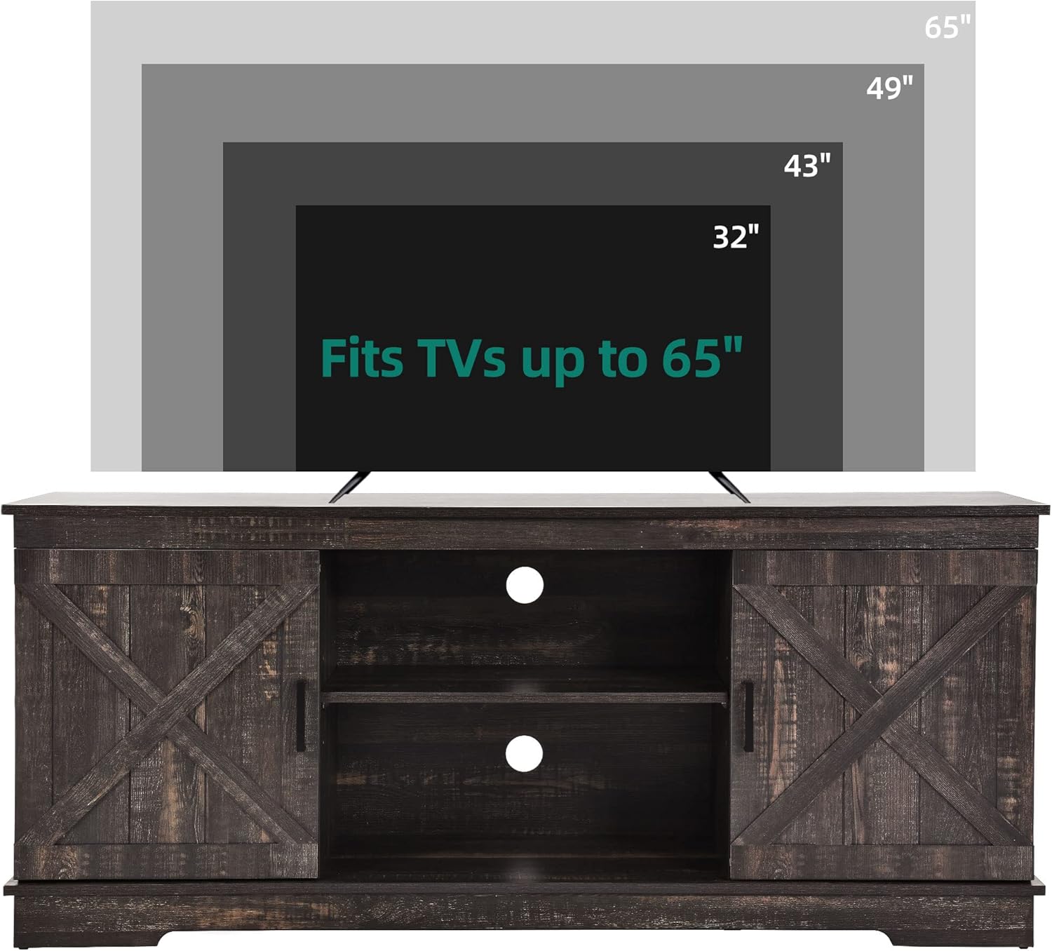 - SCRATCH-PROOF & STURDY FOR 300LBS - The farmhouse TV stand is made from well-done P2 MDF with high-level wood grain. This TV stand fits 50/ 55/ 60/ 65 inch TV. Dimensions: 15.7"D x 59.5"W x 26"H