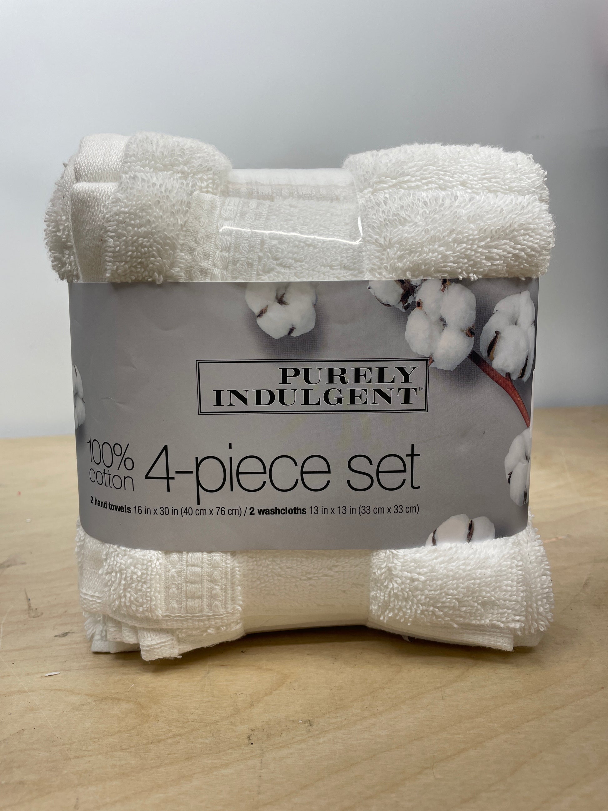 - 4-piece Towel Set Includes: 2 Hand Towels (16" W x 30" L), 2 Wash Cloths (13" W x 13" L)